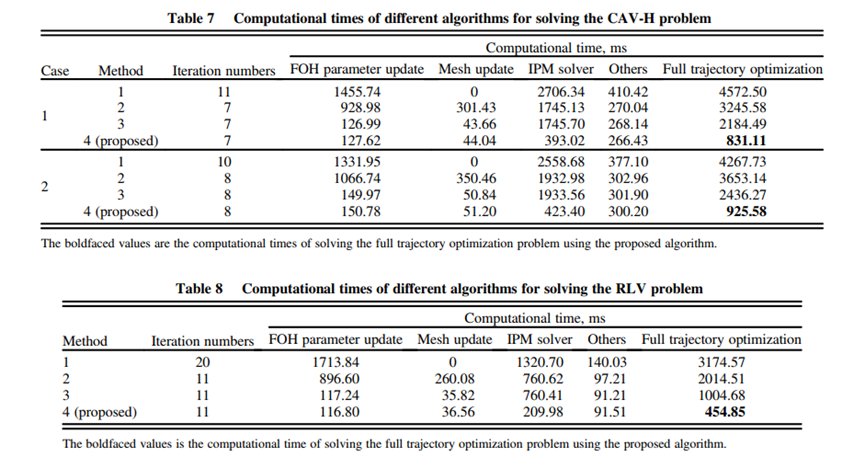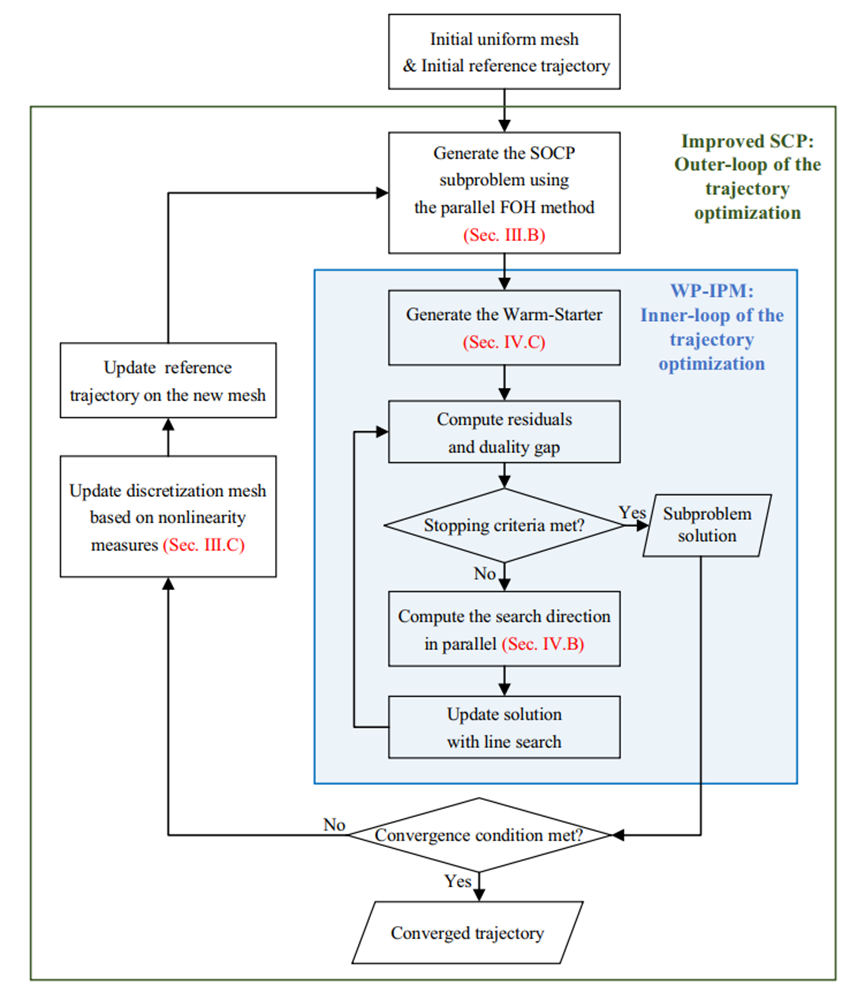 1.本研究所提出的算法的一个关键特点是利用了序列凸优化(SCP)以及内点法(IPM)的可并行性,极大地提高了算法内外循环的计算效率。针对外循环,算法基于一阶保持离散化方法提出了并行参数计算策略以及自适应网格更新策略,确保了解决方案的动态可行性,有效提高了外循环迭代的效率。