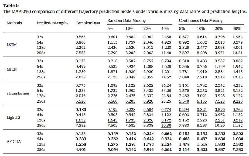 研究团队在完整轨迹与数据缺失等多种场景下开展了大量仿真实验验证。结果表明,所提 AF-CILN 模型在短时与长时预测任务中均表现稳定,预测精度整体优于现有典型深度学习模型。消融实验进一步验证了自适应哈尔小波特征融合与掩码归一化模块的有效性,掩码归一化处理方式相比传统插值方法更具优势,显著提升了模型在不完备数据下的预测可靠性。