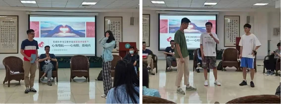本次活动除了心理知识的讲授,还别出心裁地设计了两个心理活动项目:“大风吹”和“心理剧表演”。“大风吹”游戏作为热身活动,让团体成员敞开心扉,增进团体成员间的互动。在“心理剧表演”环节,两组同学通过即兴表演生动地描述了当代大学生的内卷现象,激发了对日常常见心理健康问题的反思,从宿舍关系到改善睡眠,从考研压力到就业迷茫,在座同学踊跃分享了自己的想法,并就这些问题从心理层面提出了较为有效解决方案。最后,朱洁老师对同学们提到的这些心理健康问题进行了全面专业而细致入微地解答。